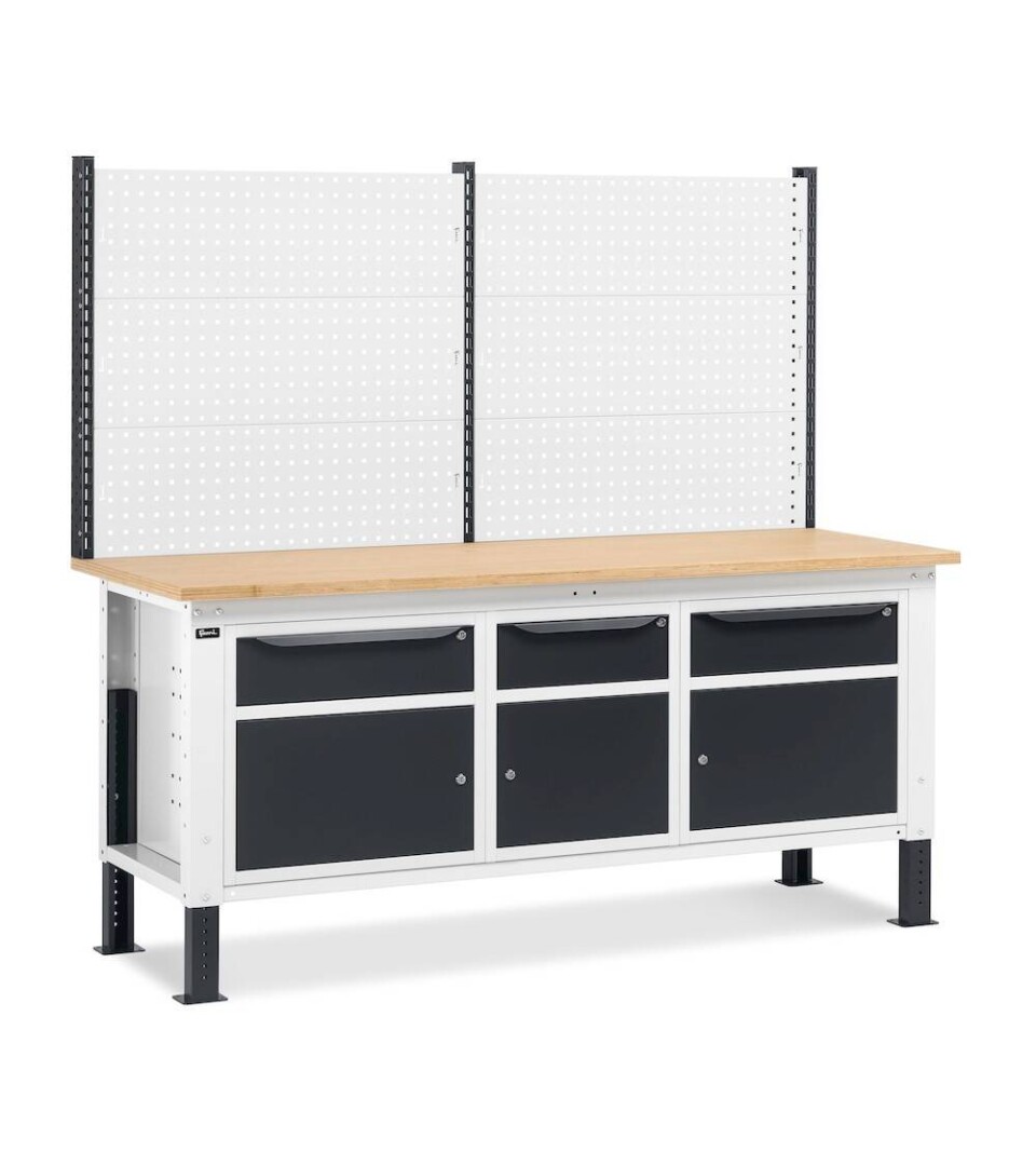 Il banco da lavoro Work Up presenta gambe regolabili che permettono di modulare l’altezza del piano in multiplex per consentire all’operatore di lavorare mantenendo una posizione ergonomica. Questa soluzione è ulteriormente arricchita da due diversi sistemi per lo stoccaggio del materiale di lavoro: nella parte superiore del banco è installata una parete attrezzata con pannelli che possono essere utilizzati anche come mensole, mentre nella parte inferiore sono presenti tre armadi con cassetto e porta parziale dotati di serratura a cilindro per custodire in sicurezza utensili e attrezzatura.