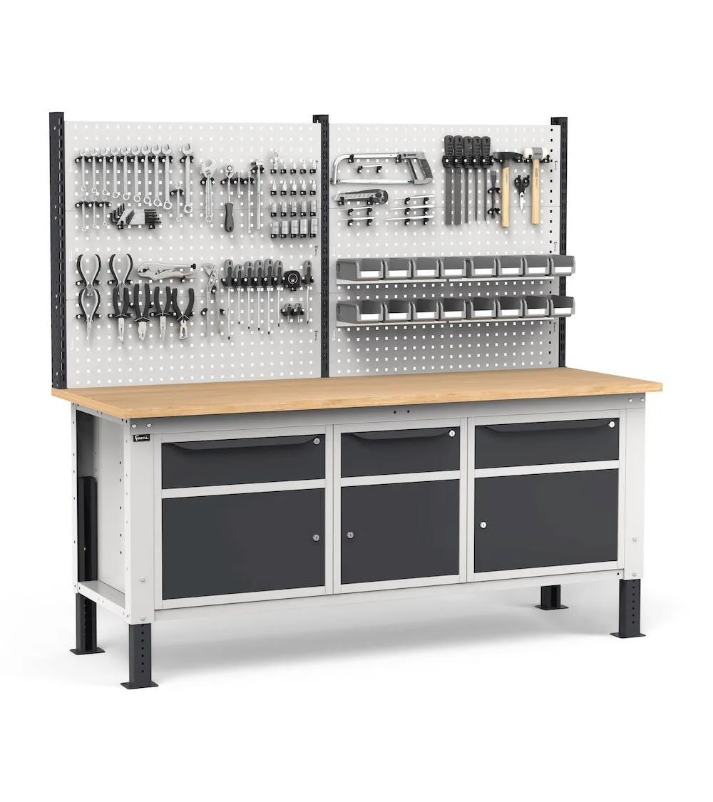 Il banco da lavoro regolabile in altezza Work Up è un componente essenziale per il lavoro quotidiano di artigiani e professionisti. Offre agli operatori la possibilità di organizzare attrezzi e minuteria andandoli a stoccare nell’armadio a cassetto o posizionandoli sul pannello forato con ganci o accessori. Il banco ha un’altezza regolabile tra 732 e 1107 mm.