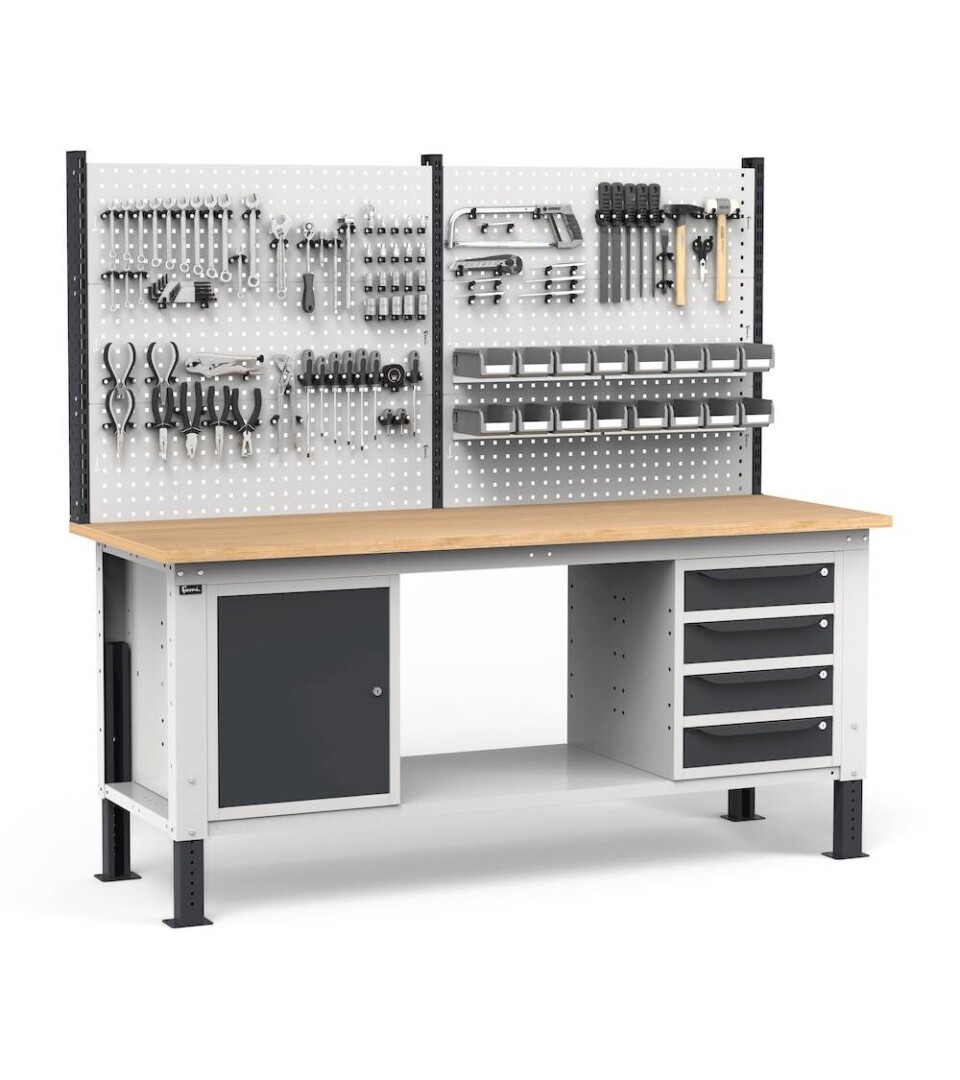 Il banco da lavoro regolabile in altezza Work Up è un componente essenziale per il lavoro quotidiano di artigiani e professionisti. Offre agli operatori la possibilità di organizzare attrezzi e minuteria andandoli a stoccare nell’armadio a cassetto o posizionandoli sul pannello forato con ganci o accessori. Il banco ha un’altezza regolabile tra 732 e 1107 mm.