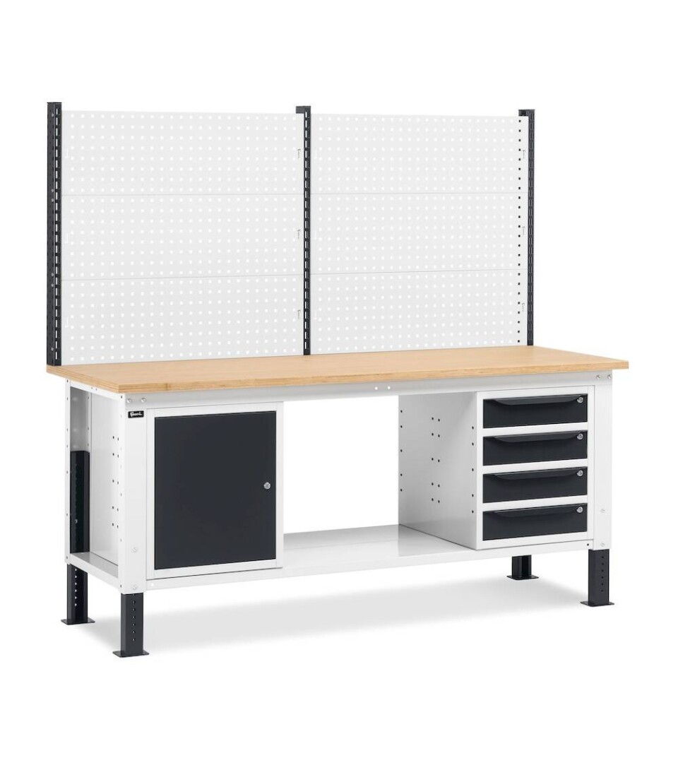 Questa configurazione del banco da lavoro regolabile in altezza Work Up offre numerose soluzioni per l’organizzazione e lo stoccaggio di tutto ciò che quotidianamente è utilizzato per il lavoro. Utensili, attrezzatura e componenti possono essere comodamente inseriti all’interno dell’armadio a 4 cassetti o dell’armadio con porta e piano regolabile. La parte superiore del banco presenta una serie di pannelli forati che possono essere utilizzati come parete attrezzata o come mensole se installati in posizione orizzontale o inclinata.