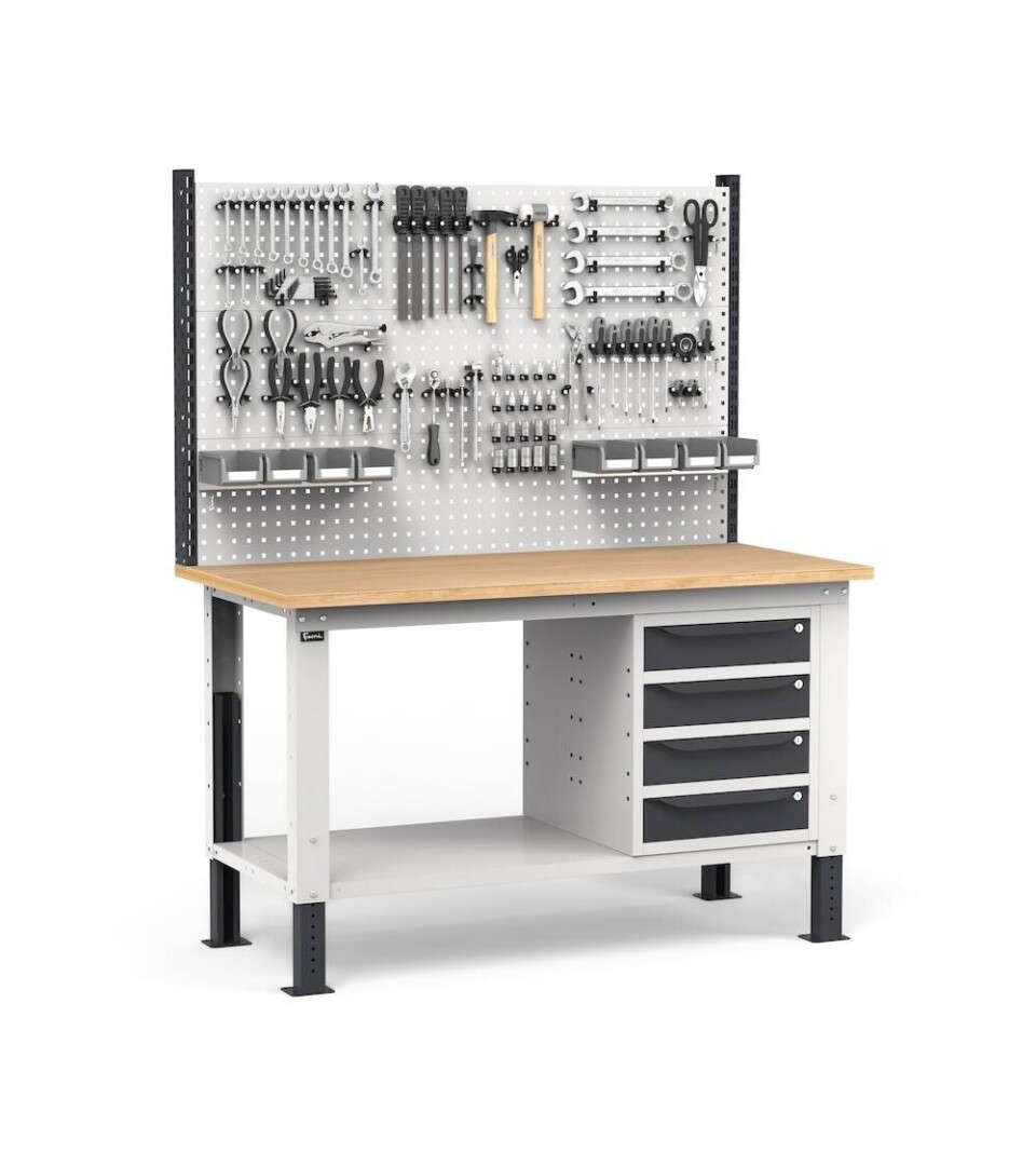 Per mantenere tutto il materiale di lavoro in ordine e facilmente accessibile, il banco da lavoro è dotato di un armadio a 4 cassetti con estrazione al 86%. Ogni cassetto ha una portata di 80 kg, offrendo una soluzione robusta e affidabile per riporre utensili, ricambi e minuteria. L’organizzazione diventa un gioco da ragazzi quando ogni strumento ha il suo spazio dedicato.