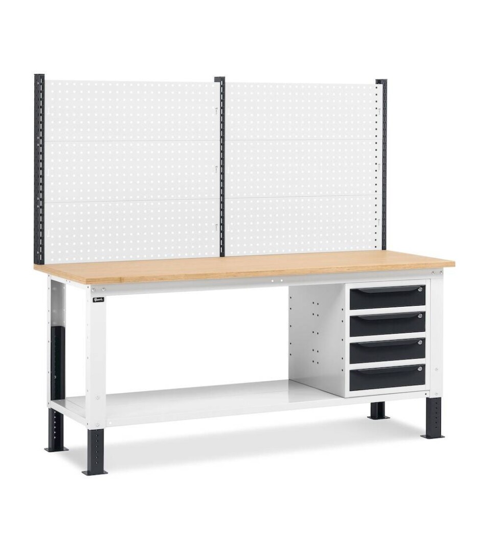 Il tavolo da lavoro con 4 cassetti Work Up presenta gambe regolabili in altezza per modulare la posizione del piano di lavoro in multiplex. L’installazione del semipiano inferiore aggiuntivo consente di creare un piano profondo come il banco nella parte inferiore così da poter stoccare attrezzatura o componenti di grandi dimensioni che non possono essere contenuti nei 4 cassetti. Gli utensili maggiormente utilizzati possono essere liberamente organizzati sulla parete attrezzata a foro quadro attraverso l’uso di accessori Iron Team o ganci Unipok.