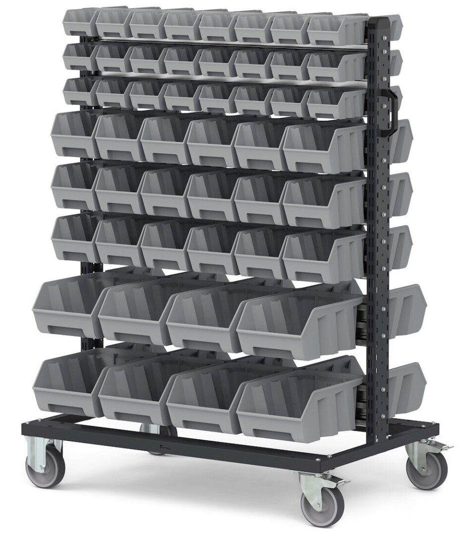 Tre o quattro ripiani con altezze diverse. Il carrello resta compatto ma raddoppia lo spazio utile. Perfetto negli e-commerce di minuteria o ricambi auto dove i contenitori a vaschetta sono la norma.