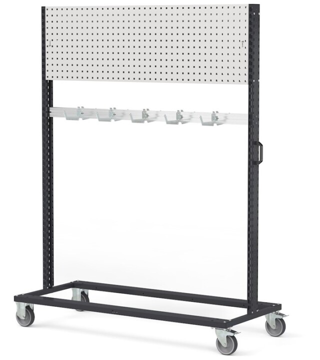 Il carrello per imbracature con pannello forato Bin Cart facilita l’organizzazione di attrezzatura di vario tipo. Imbracature, cavi, prolunghe e tubi possono essere stoccati in ordine e sicurezza sui ganci porta cavi con estremità ad uncino, mentre la parete attrezzata può ospitare porta bombolette, mensole, pensili e ulteriori accessori Iron Team per l’organizzazione di utensili, attrezzature e componenti. Il carrello è completato da una maniglia laterale e da ruote in gomma antitraccia sintetica, due fisse e due girevoli.