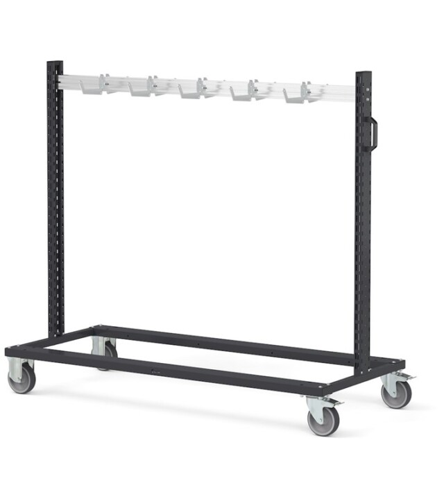 Il carrello per imbracature permette di custodire in ordine imbracature, cavi, prolunghe e funi che solitamente sono riposti in azienda o in officina alla rinfusa, ingrovigliati o con nodi. Presenta una serie di ganci installati su un profilo in alluminio la cui posizione è facilmente regolabile grazie al fissaggio composto da inserto con vite. Il carrello Bin Cart è movimentabile grazie alla pratica maniglia laterale e al set di ruote in gomma antitraccia sintetica.