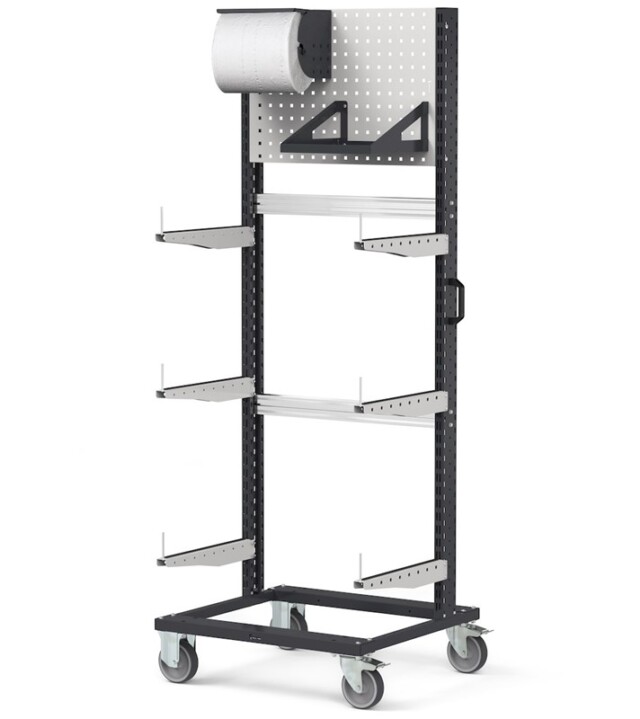 Questo soluzione Bin Cart consente di combinare i benefici di un carrello rastrelliera con quelli di un carrello porta attrezzi. La composizione, infatti, presenta due diverse aree di utilizzo: la parte superiore è allestita con un pannello forato dotato di mensola e porta rotoli, a cui possono essere aggiunti ulteriori accessori; la parte inferiore, invece, può essere dedicata allo stoccaggio di materiali lunghi, come travi o tubi, vista la presenza di supporti dotati di gomma antiscivolo e fermi anticaduta. La struttura del carrello Bin Cart è resa più solida e robusta dai profili in alluminio ed è completata da maniglia laterale e ruote in gomma antitraccia sintetica.