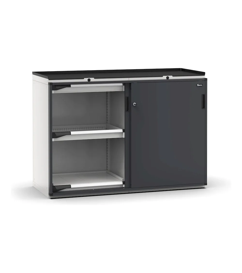 L’armadietto portautensili con porte scorrevoli presenta diverse soluzioni di stoccaggio: 4 cassetti e 2 piani estraibili, entrambi ad estrazione telescopica. È così possibile custodire componenti di medie e grandi dimensioni sui ripiani, mentre utensili e minuteria possono essere inseriti nei cassetti in modo ordinato tramite l’uso di divisori o cassette contenitore. In alternativa, gli attrezzi possono essere organizzati sui vassoi porta utensili Pikpad. Il piano a 3 bordi in PVC consente di utilizzare il piano superiore come superficie di lavoro senza danneggiarlo.