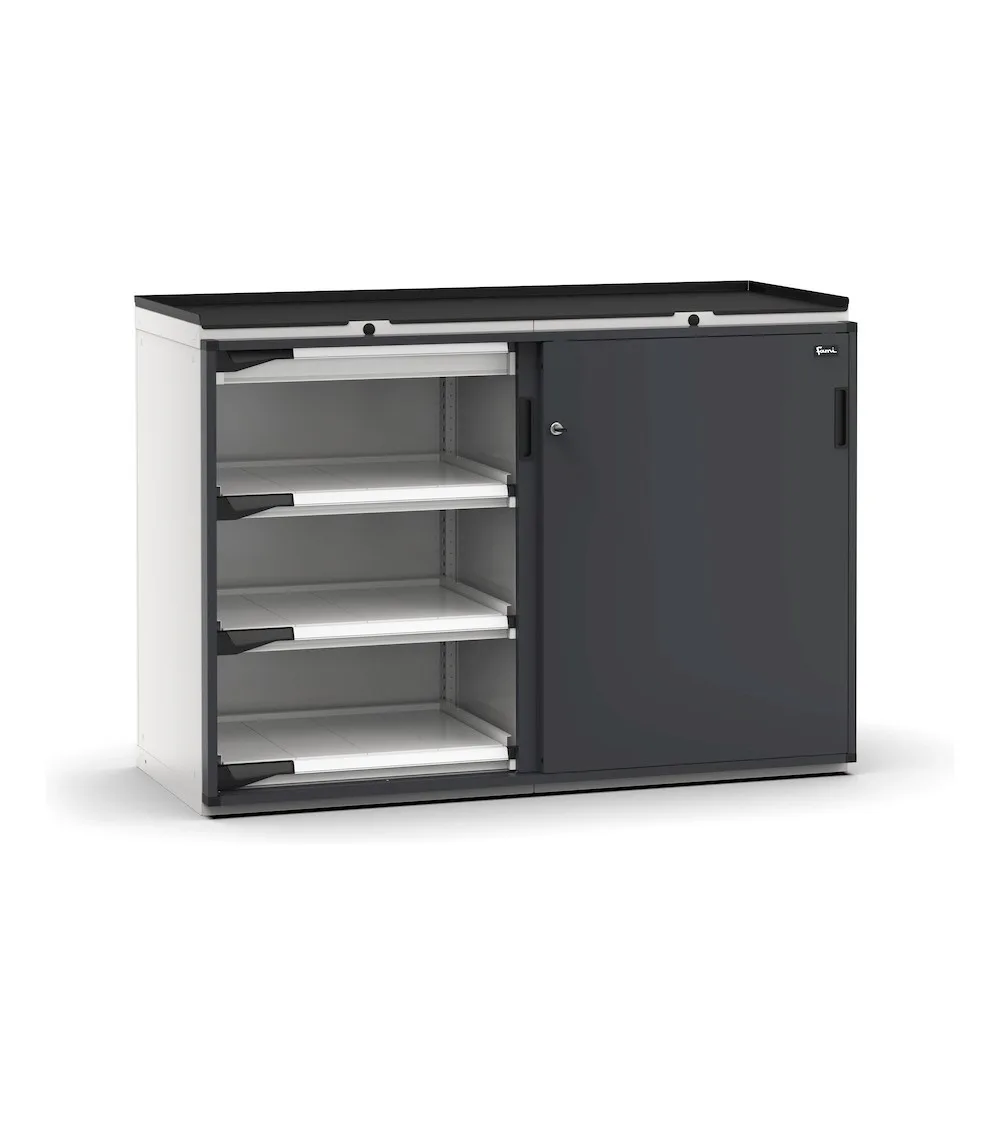 L’armadietto portautensili con porte scorrevoli presenta diverse soluzioni di stoccaggio: 2 cassetti e 6 piani estraibili, entrambi ad estrazione telescopica. È così possibile custodire componenti di medie e grandi dimensioni sui ripiani, mentre utensili e minuteria possono essere inseriti nei cassetti in modo ordinato tramite l’uso di divisori o cassette contenitore. In alternativa, gli attrezzi possono essere organizzati sui vassoi porta utensili Pikpad. Il piano a 3 bordi in PVC consente di utilizzare il piano superiore come superficie di lavoro senza danneggiarlo.