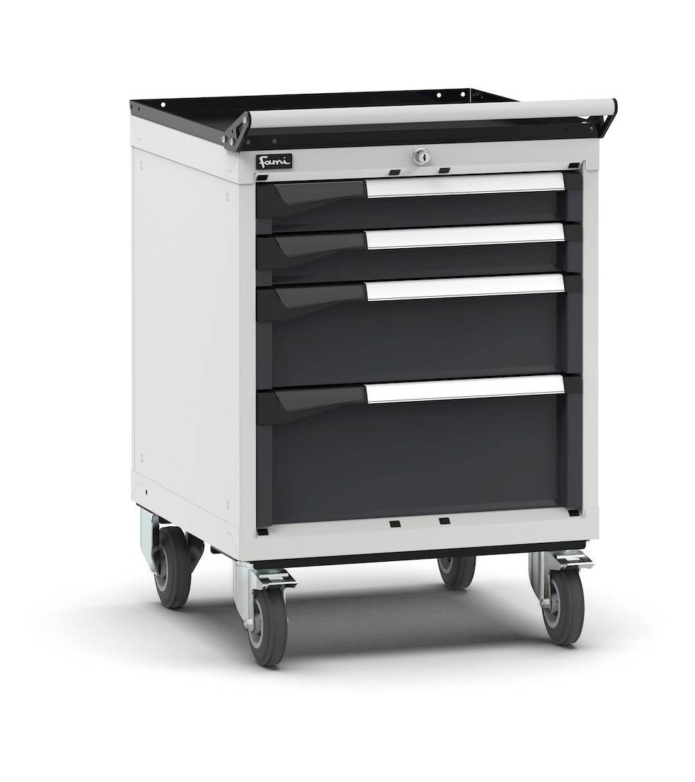 La cassettiera porta attrezzi con ruote è una soluzione pratica e compatta per creare kit mobili di pronto intervento pronti a tutto. I 4 cassetti ad estrazione flessibile, infatti, possono essere organizzati al millimetro installando il materiale di separazione come divisori o contenitori, oppure integrando i vassoi porta utensili Pikpad. Maniglia e ruote in gomma elastica rendono la movimentazione del carrello semplice e agile, mentre il piano a 4 bordi in PVC previene la caduta del materiale posto sul piano superiore del carrello.