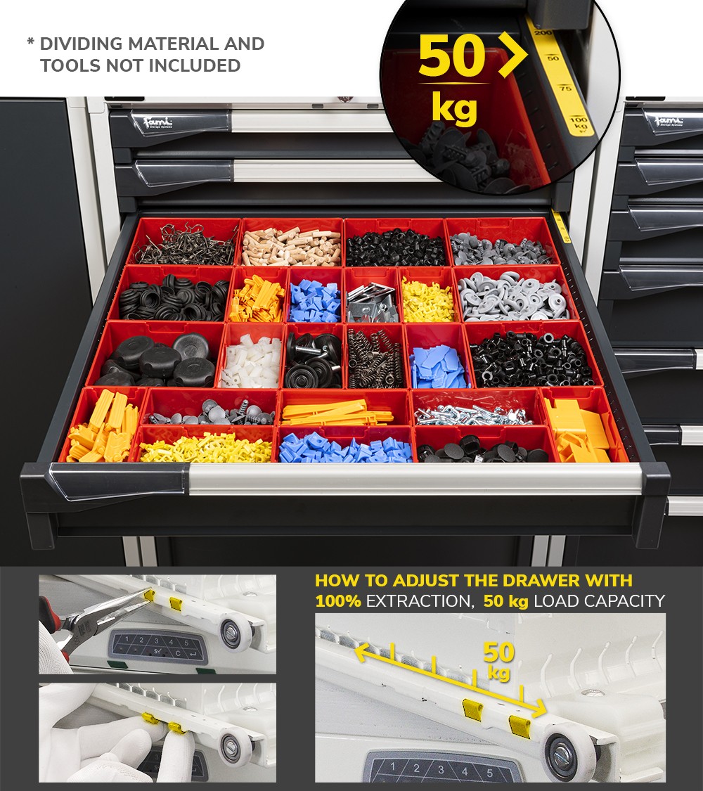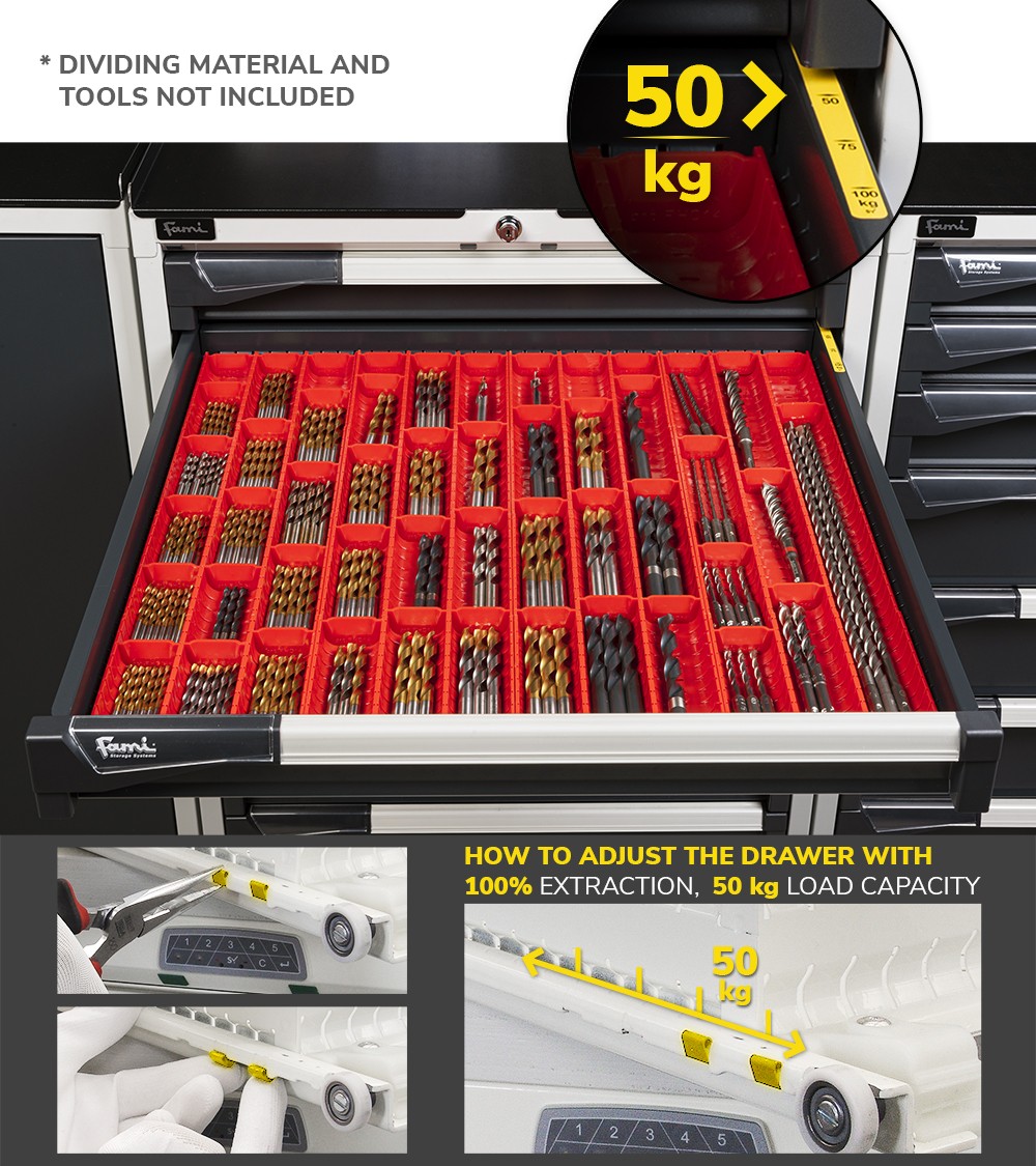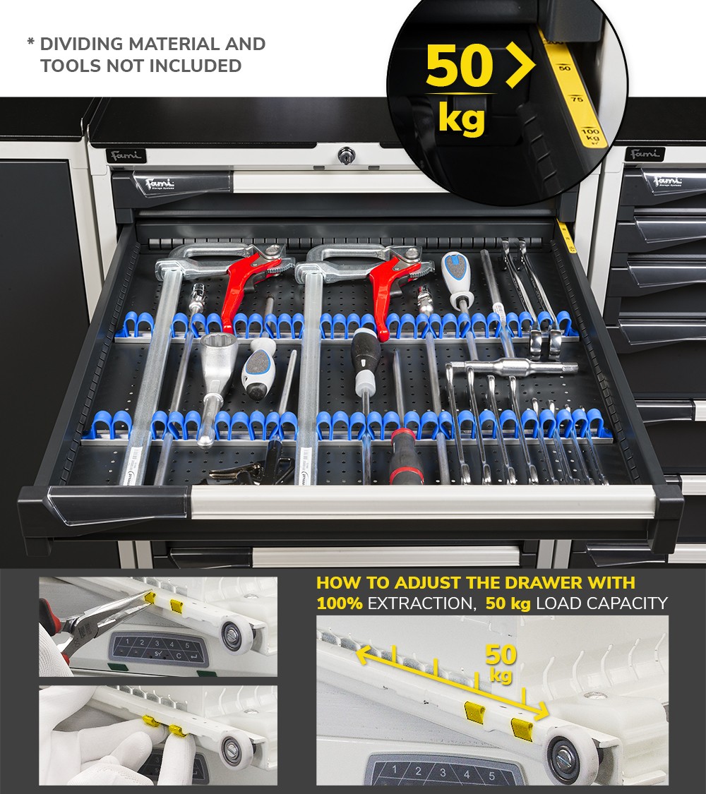 I cassetti presentano fondo forato e lati fessurati che agevolano l’installazione di divisori in metallo o contenitori per personalizzare lo spazio interno e mantenere gli utensili ordinati e facilmente accessibili. In alternativa, i vassoi portautensili Pikpad possono essere utilizzati per un’ulteriore organizzazione.