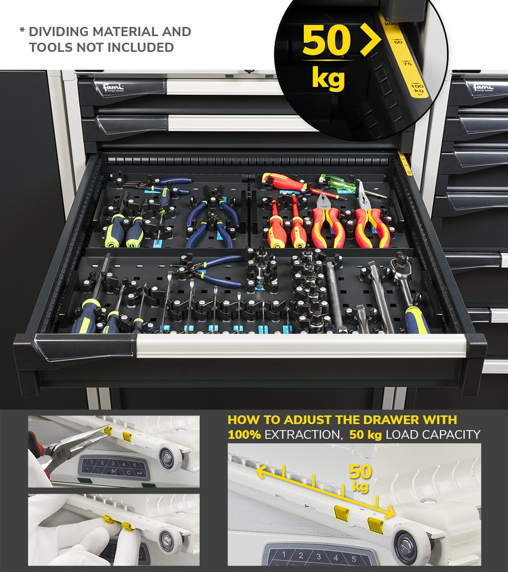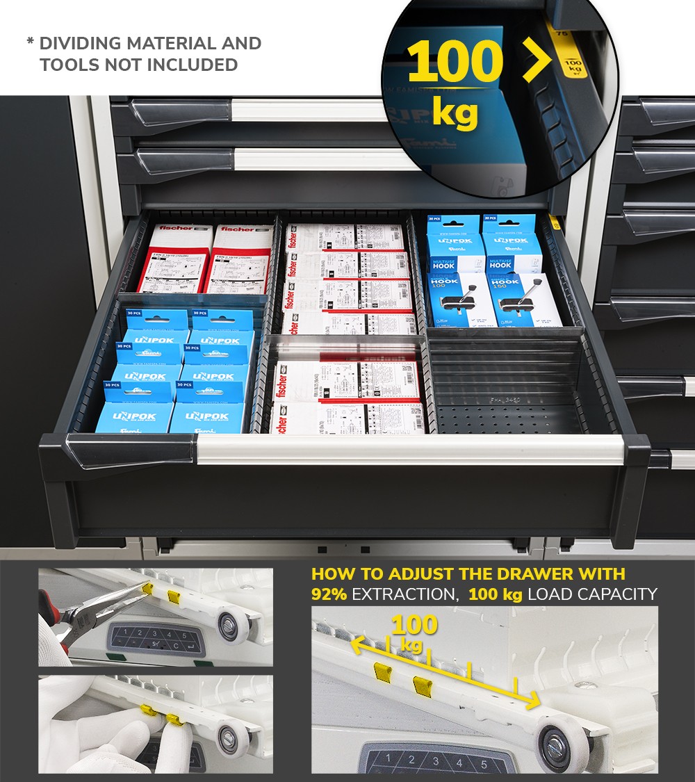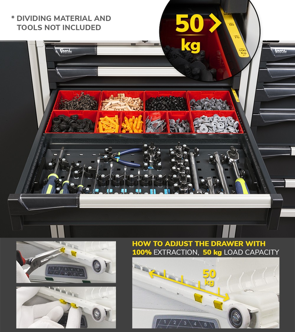 I cassetti presentano fondo forato e lati fessurati che agevolano l’installazione di divisori in metallo o contenitori per personalizzare lo spazio interno e mantenere gli utensili ordinati e facilmente accessibili. In alternativa, i vassoi portautensili Pikpad possono essere utilizzati per un’ulteriore organizzazione.