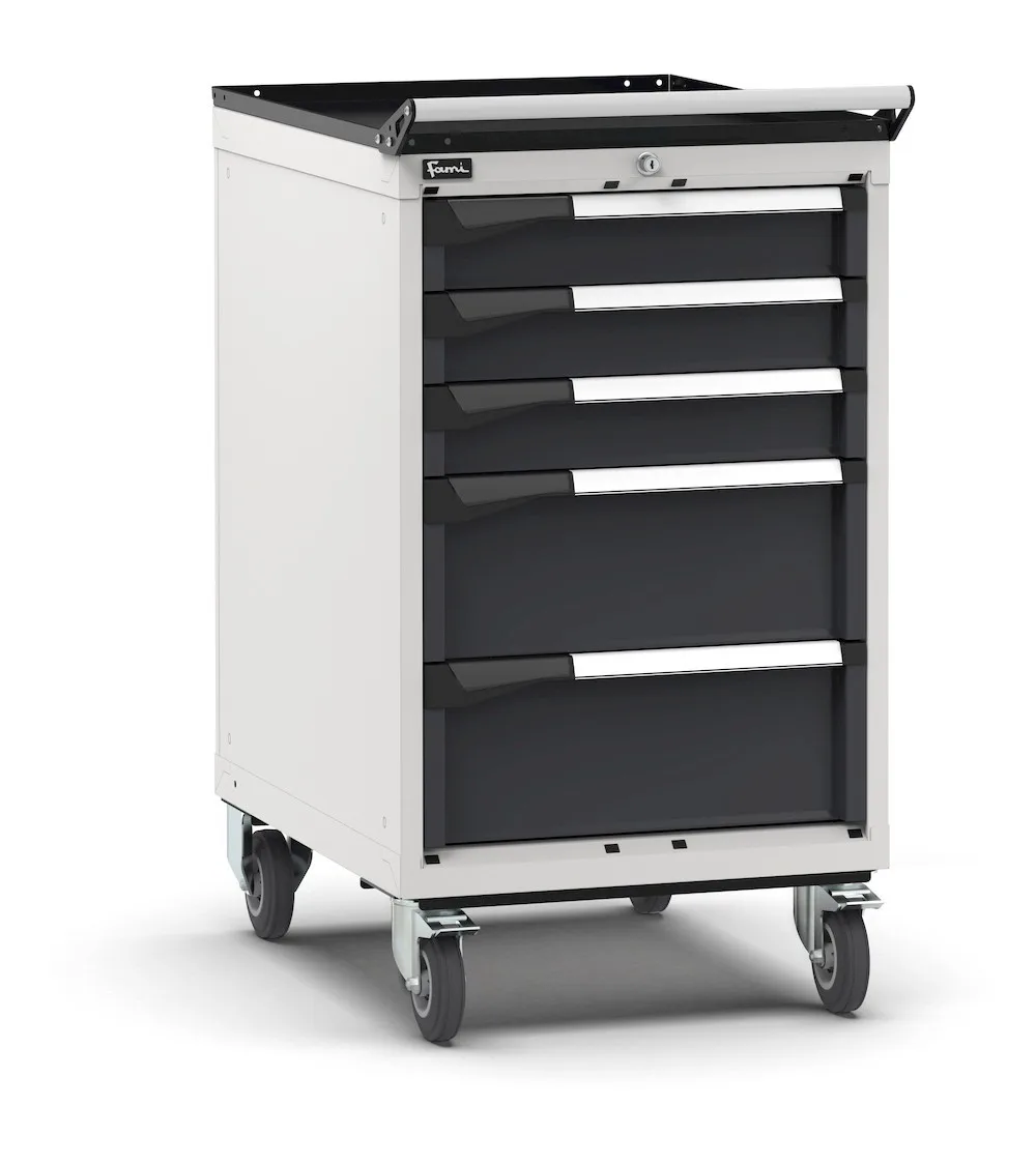 La cassettiera porta attrezzi con ruote è la soluzione ideale per disporre di una postazione mobile per attività di manutenzione o riparazione. Grazie a ruote in gomma elastica e maniglia può essere spostata all’interno dell’azienda per avere a disposizione utensili e componenti custoditi in sicurezza nei 5 cassetti ad estrazione flessibile. L’interno di ogni cassetto è organizzabile tramite i diversi materiali di separazione come divisori in metallo o cassette divisorio. In alternativa è possibile utilizzare i vassoi porta utensili Pikpad. La serratura centrale è a cilindro con chiave.