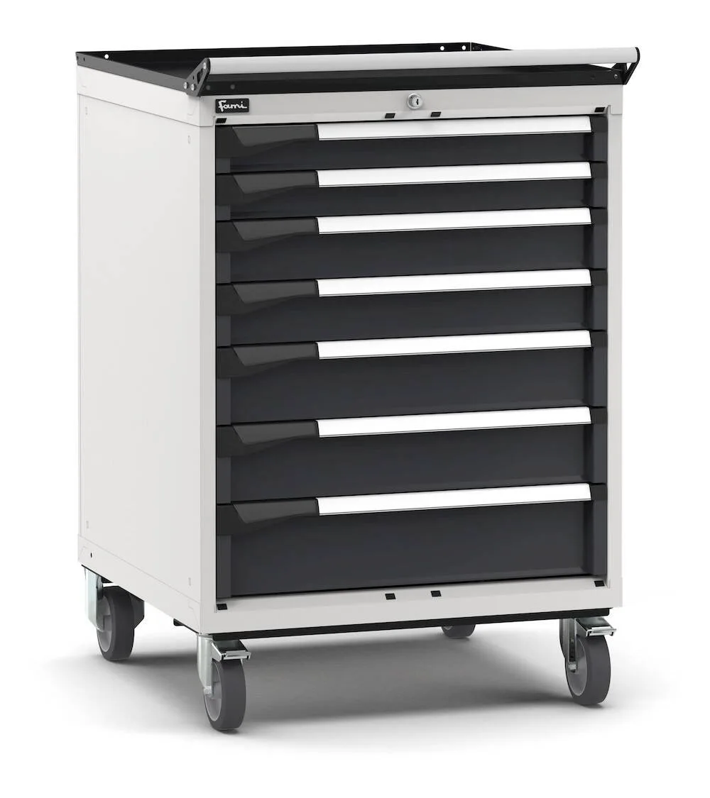 La cassettiera porta attrezzi con ruote è uno strumento versatile e funzionale per l’organizzazione e la movimentazione del materiale di lavoro. Utensili e componenti sono custoditi al sicuro e in ordine grazie alla serratura a cilindro con chiave e ai 7 cassetti ad estrazione flessibile. Quest’ultimi possono essere suddivisi internamente tramite divisori in metallo e cassette contenitori, o, in alternativa, possono ospitare i Pikpad, vassoi portautensili mobili. Le ruote in gomma elastica e la maniglia completano il carrello per agevolarne lo spostamento all’interno dell’azienda.