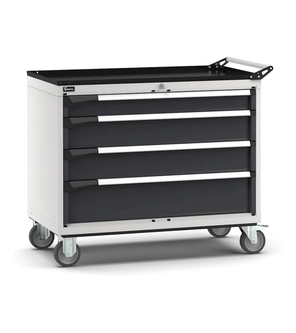 La cassettiera porta attrezzi con ruote è una soluzione pratica e compatta per creare kit mobili di pronto intervento pronti a tutto. I 4 cassetti ad estrazione flessibile, infatti, possono essere organizzati al millimetro installando il materiale di separazione come divisori o contenitori, oppure integrando i vassoi porta utensili Pikpad. Maniglia e ruote in gomma elastica rendono la movimentazione del carrello semplice e agile, mentre il piano a 4 bordi in PVC previene la caduta del materiale posto sul piano superiore del carrello.