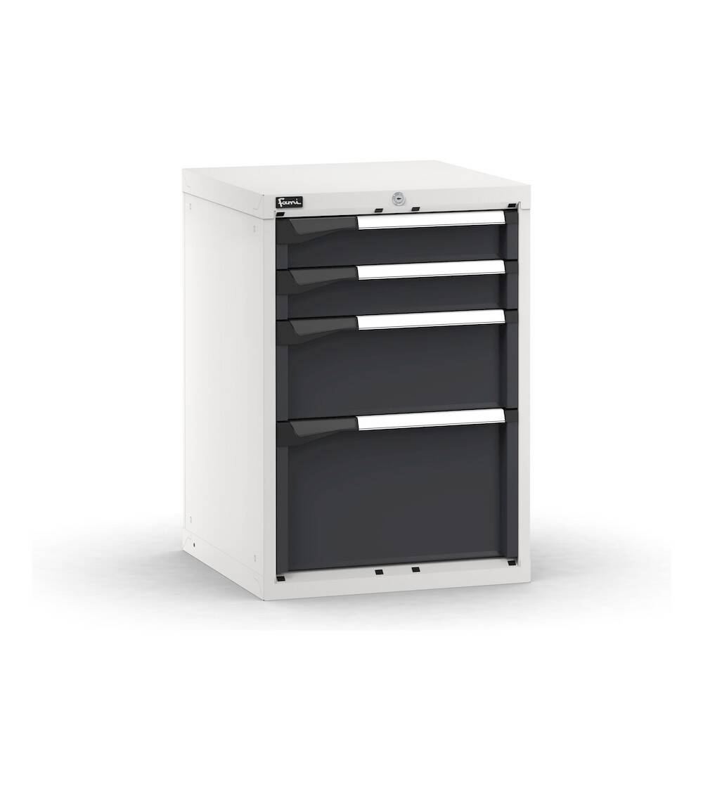 Il blocco cassettiera da banco è costituito da un set di 4 cassetti ad estrazione flessibile di altezze diverse per consentire lo stoccaggio di una grande varietà di utensili e ricambi. Il fondo forato e i lati fessurati dei cassetti facilitano l’installazione dei diversi tipi di materale di separazione come vaschette e divisori. In alternativa è possibile inserire i vassoi Pikpad per ordinare l’attrezzatura usata più di frequent. È dotato di serratura a cilindro con chiave e può essere utilizzato sia come armadio a cassetti che come complemento di banchi da lavoro.