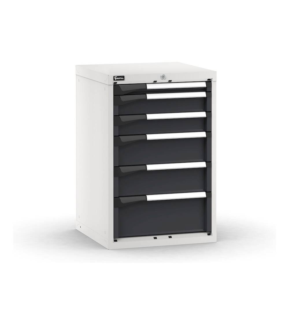 Il blocco cassettiera da banco presenta 6 cassetti ad estrazione flessibile e una serratura a cilindro con chiave. I cassetti di altezze differenti permettono la custodia organizzata di una grande varietà di attrezzatura tramite l’uso di cassette divisorio o divisori in metallo. Una pratica alternativa a questi materiali di separazione sono i Pikpad, vassoi portautensili movimentabili e liberamente organizzabili. Il blocco cassettiera è installabile in banchi da lavoro o utilizzabile singolarmente per rendere ancora più funzionale un reparto o un’officina.