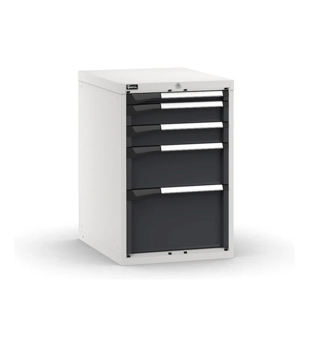Il blocco cassettiera da banco può essere installato in un banco da lavoro oppure utilizzato come pratica cassettiera portautensili in officina o reparto. Ha 5 cassetti ad estrazione flessibile di varie altezze caratterizzati da fondo forato e lati scanalati per l’installazione di divisori e cassette contenitore. L’interno del cassetto può essere anche allestito utilizzato i vassoi portautensili Pikpad. La sicurezza è garantita dalla serratura a cilindro con chiave che blocca l’apertura di tutti i cassetti ed evita l’accesso al personale non autorizzato.