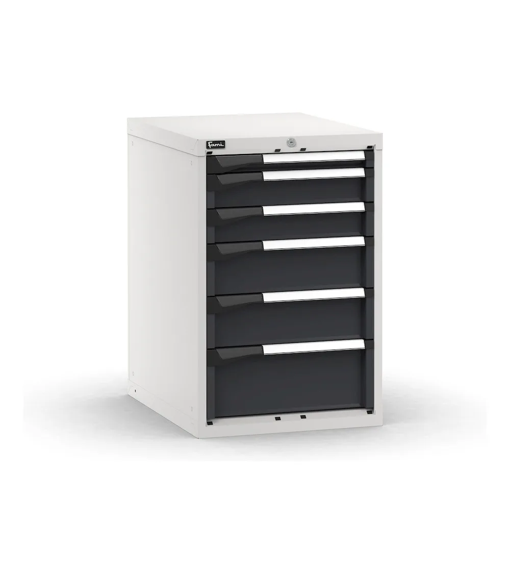 Il blocco cassettiera da banco presenta 6 cassetti ad estrazione flessibile e una serratura a cilindro con chiave. I cassetti di altezze differenti permettono la custodia organizzata di una grande varietà di attrezzatura tramite l’uso di cassette divisorio o divisori in metallo. Una pratica alternativa a questi materiali di separazione sono i Pikpad, vassoi portautensili movimentabili e liberamente organizzabili. Il blocco cassettiera è installabile in banchi da lavoro o utilizzabile singolarmente per rendere ancora più funzionale un reparto o un’officina.