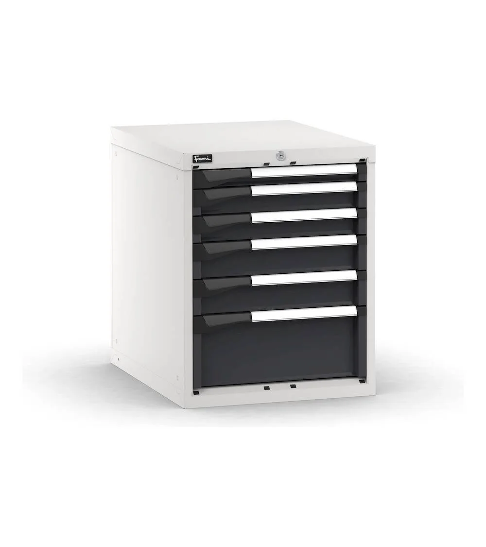 Le Cassettiere metalliche per officina rappresentano un elemento essenziale per mantenere un ambiente di lavoro organizzato e funzionale. Il blocco cassettiera da banco offre 6 cassetti ad estrazione flessibile, dotati di serratura a cilindro con chiave per garantire la sicurezza dei materiali e degli utensili custoditi.