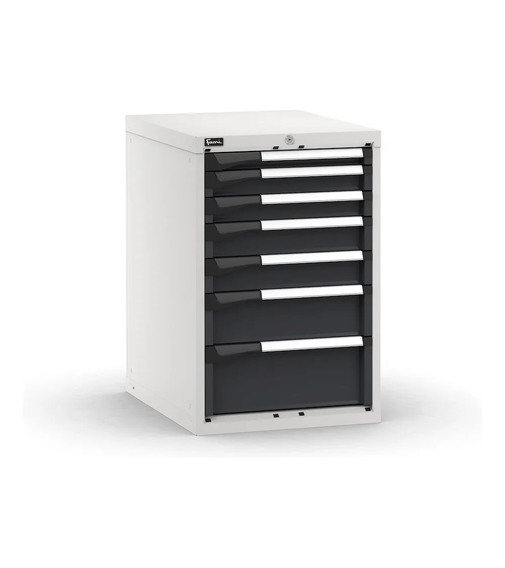 Il blocco cassettiera da banco con 7 cassetti ad estrazione flessibile può essere utilizzato singolarmente come portautensili in officina o reparto oppure può essere installato nei banchi da lavoro. Utensili, attrezzi e ricambi possono essere inseriti in ordine all’interno dei cassetti con altezze diverse grazie all’uso di cassette portaminuteria o divisori in metallo. Un ulteriore soluzione di organizzazione sono i Pikpad, vassoi portautensili. La serratura a cilindro con chiave garantisce la custodia sicura del materiale stoccato.
