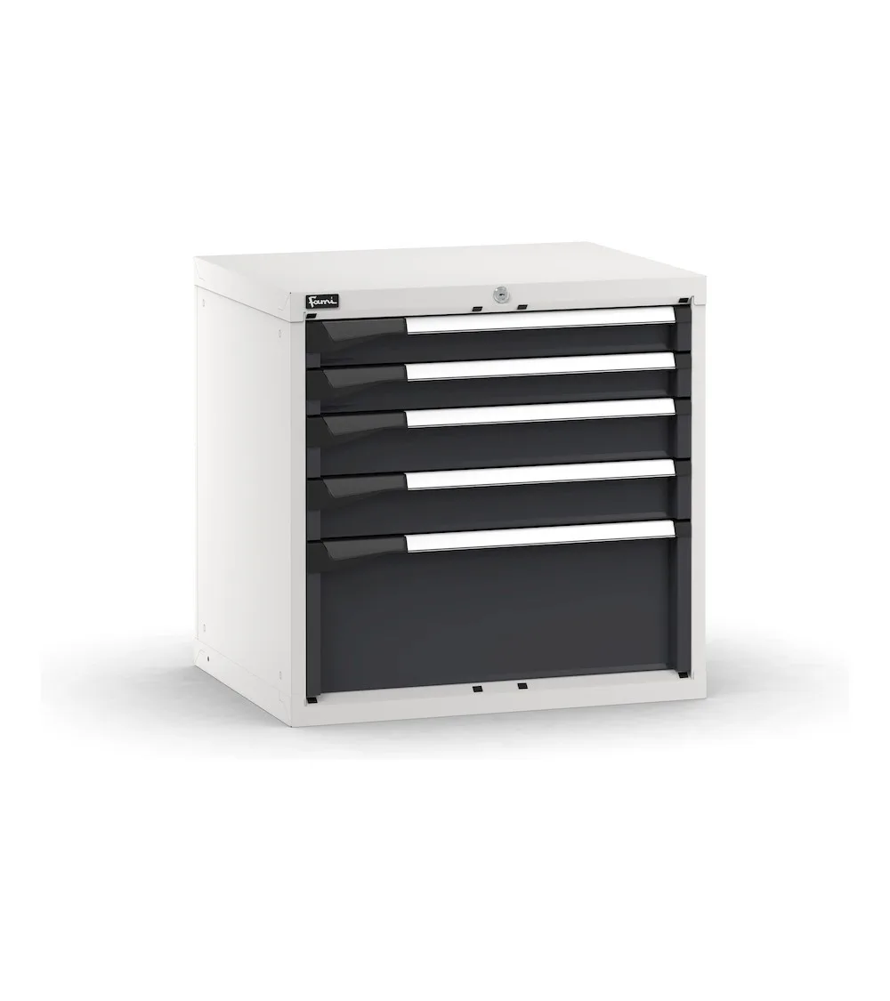 Il blocco cassettiera da banco può essere installato in un banco da lavoro oppure utilizzato come pratica cassettiera portautensili in officina o reparto. Ha 5 cassetti ad estrazione flessibile di varie altezze caratterizzati da fondo forato e lati scanalati per l’installazione di divisori e cassette contenitore. L’interno del cassetto può essere anche allestito utilizzato i vassoi portautensili Pikpad. La sicurezza è garantita dalla serratura a cilindro con chiave che blocca l’apertura di tutti i cassetti ed evita l’accesso al personale non autorizzato.