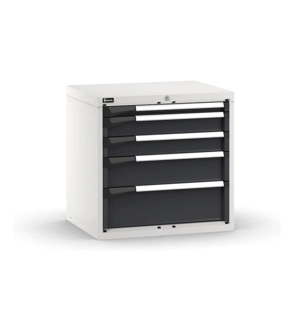 Il blocco cassettiera da banco può essere installato in un banco da lavoro oppure utilizzato come pratica cassettiera portautensili in officina o reparto. Ha 5 cassetti ad estrazione flessibile di varie altezze caratterizzati da fondo forato e lati scanalati per l’installazione di divisori e cassette contenitore. L’interno del cassetto può essere anche allestito utilizzato i vassoi portautensili Pikpad. La sicurezza è garantita dalla serratura a cilindro con chiave che blocca l’apertura di tutti i cassetti ed evita l’accesso al personale non autorizzato.