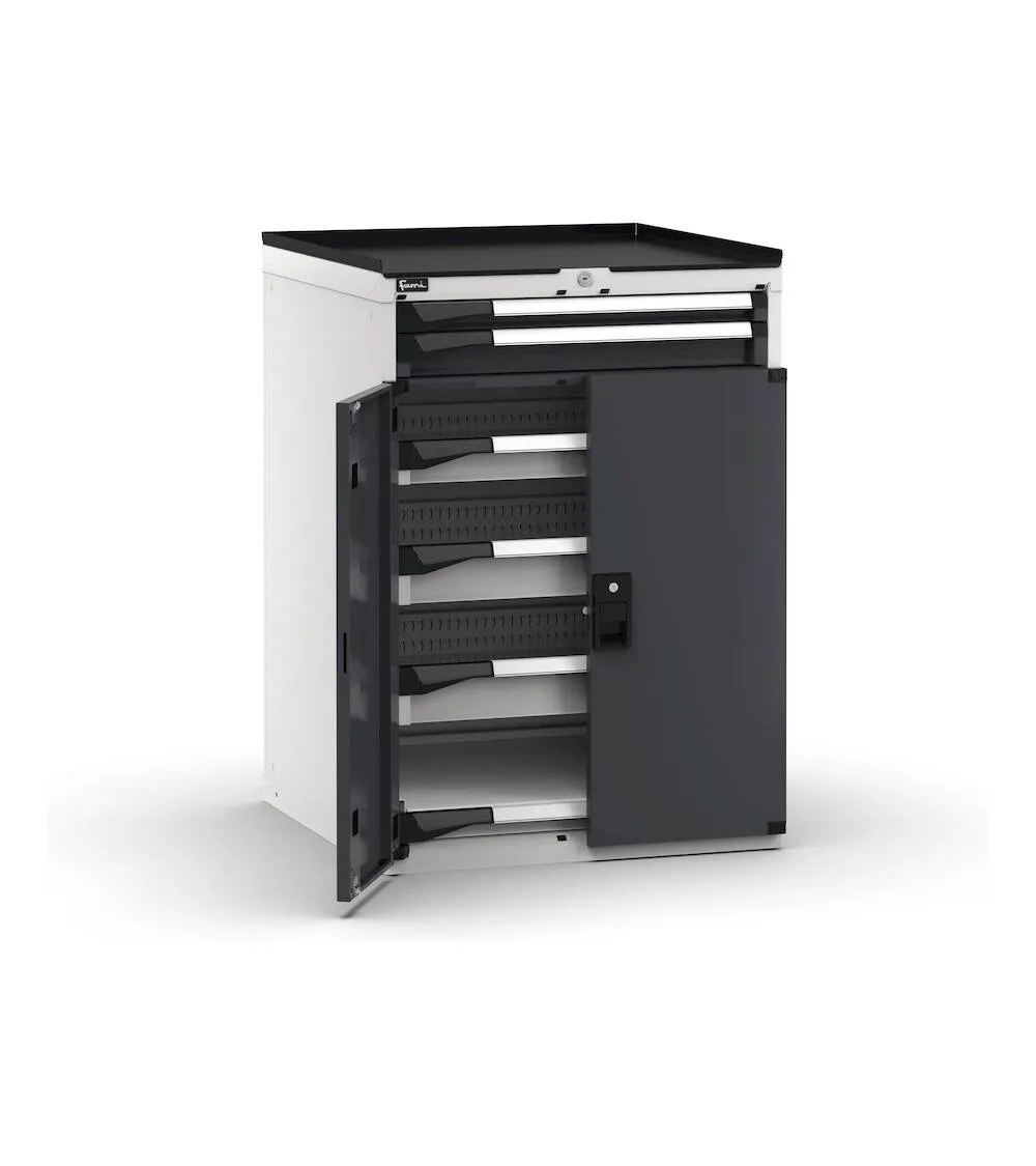 L’armadietto portautensili può essere impiegato sia come soluzione di stoccaggio, grazie a 5 cassetti e a 1 piano, entrambi ad estrazione flessibile, sia come postazione di lavoro. Il piano di lavoro a 3 bordi in PVC, infatti, protegge l’armadio e permette di effettuare numerose lavorazioni e operazioni. Lo spazio interno del cassetto può essere organizzato tramite materiale di separazione o vassoi portautensili Pikpad. Le porte presentano serratura a cilindro e apertura a battente.