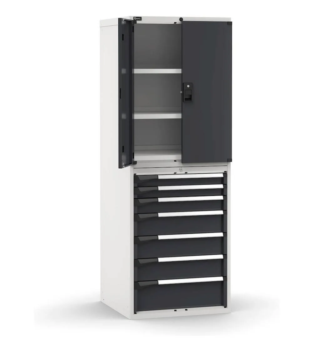 L’armadio portautensili è ideale in spazi limitati in quanto si sviluppa in altezza e aumenta esponenzialmente l’area di immagazzinamento. Questa soluzione è composta da una cassettiera inferiore con 7 cassetti ad estrazione telescopica e un armadio con ante a battente superiore con 3 ripiani regolabili in altezza. Entrambi gli elementi sono dotati di serratura a cilindro con chiave. I cassetti presentano altezze frontali diverse e possono essere suddivisi internamente con il materiale di separazione, come divisori o contenitori, o con i vassoi portautensili Pikpad.