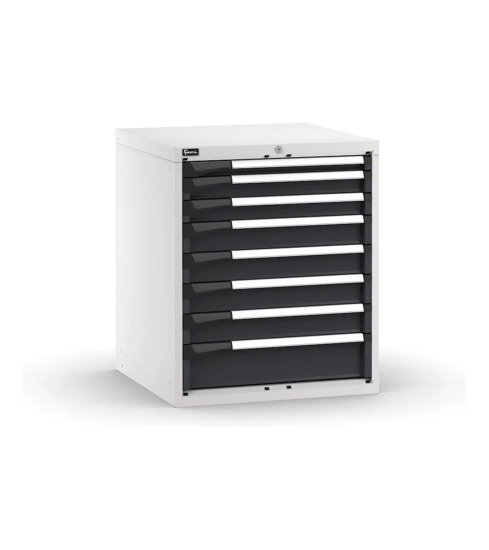 Il blocco cassettiera da banco è dotato di 8 cassetti ad estrazione flessibile e di una serratura a cilindro con chiave per la custodia ordinata e sicura di attrezzatura, utensili e minuteria. I cassetti hanno altezze frontali differenti e possono essere allestiti con divisiori in metallo, vaschette contenitore oppure tramite i pratici Pikpad, vassoi portautensili configurabili e movimentabili. La cassettiera può essere utilizzata come complemento di un banco oppure come soluzione portautensili accanto a macchinari o in officina.