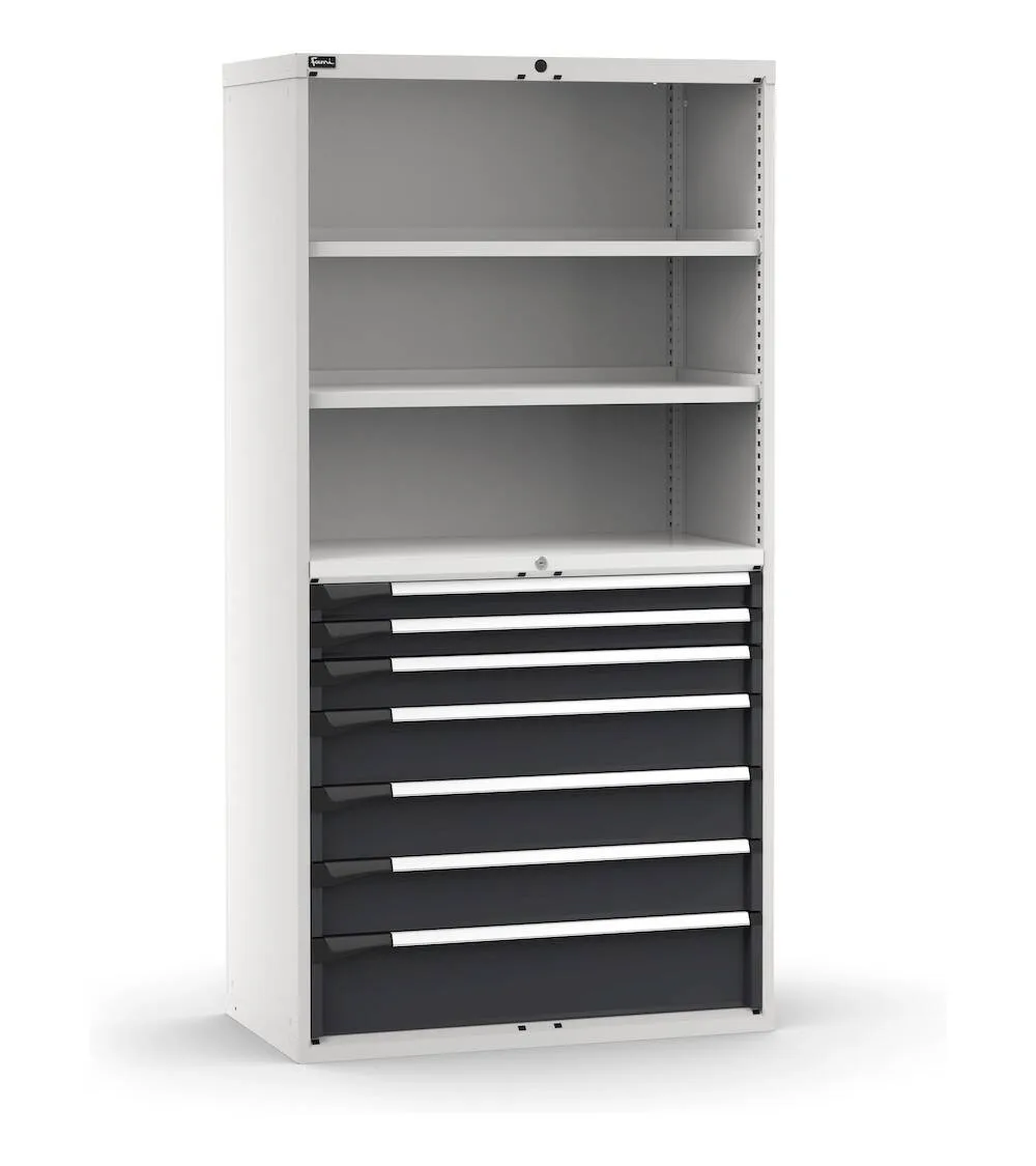 L’armadio portautensili può essere impiegato come pratico scaffale in cui è possibile stoccare una vasta gamma di materiali e attrezzatura. Presenta 7 cassetti ad estrazione telescopica nella parte inferiore e 2 ripiani regolabili in altezza nella parte superiore. La cassettiera è dotata di serratura a cilindro con chiave e i 7 cassetti con altezze frontali differenti sono allestibili internamente con divisori, cassette contenitore o con i vassoi portautensili Pikpad.