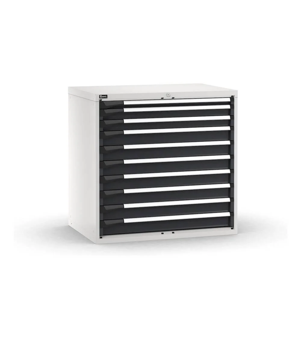 Con la cassettiera porta attrezzi è possibile dotare un’area di lavoro di un pratico sistema di stoccaggio di tutti gli utensili, componenti e ricambi utilizzati durante le attività quotidiane. È dotata di 10 cassetti ad estrazione flessibile con altezze frontali diverse così da poter contenere materiali di dimensioni e volumi diversi. Divisori e vaschette contenitore facilitano l’organizzazione interna del cassetto. Quest’ultimo può essere allestito anche sfruttando i vassoi portautensili mobili Pikpad. La serratura è a cilindro con chiave.
