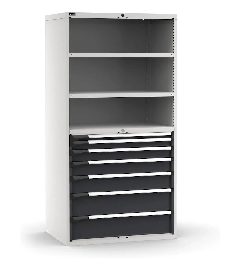L’armadio portautensili è suddiviso in due aree: nella parte inferiore sono presenti 4 cassetti ad estrazione telescopica, mentre nella parte superiore 2 piani fessurati regolabili in altezza. Il doppio sistema di stoccaggio permette di organizzare al meglio tutto il materiale di lavoro. I cassetti possono essere allestiti internamente con il tradizionale materiale di separazione composto da divisori o cassette contenitore, oppure tramite i vassoi portautensili Pikpad. La loro chiusura è regolata dalla serratura a cilindro con chiave.