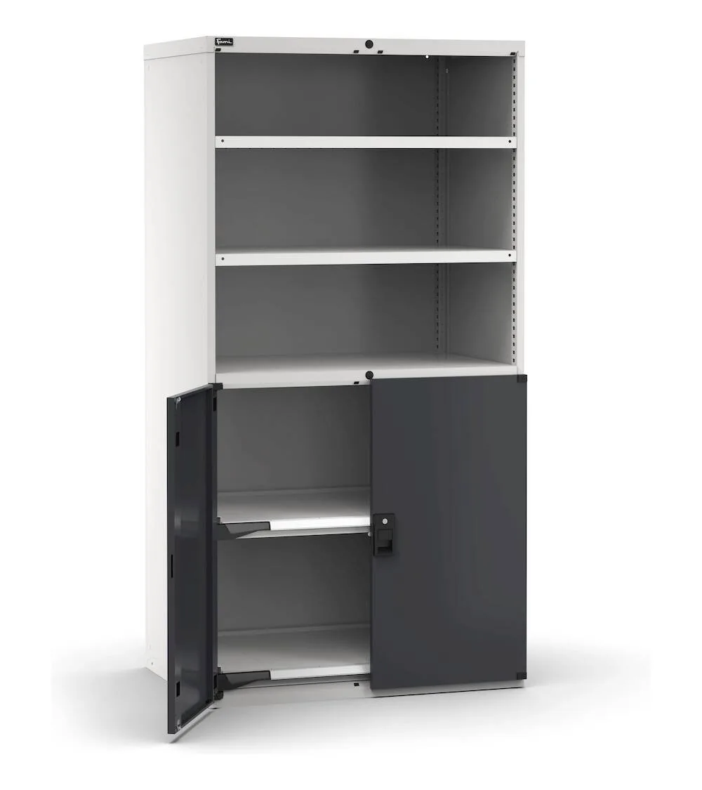 Ideale come scaffale per magazzino o ufficio, l’armadio portautensili presenta una struttura monoblocco suddivisa in due aree di stoccaggio. Nella parte inferiore sono installati 2 piani estraibili ad estrazione flessibile e una coppia porte con serratura a cilindro, mentre la parte superiore è allestita con 2 ripiani fessurati regolabili in altezza. Quest’ultimi consentono di regolare lo spazio a disposizione in base alla quantità e al volume dei prodotti da organizzare.