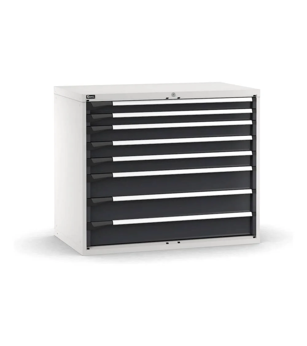 La cassettiera porta attrezzi è allestita con 8 cassetti ad estrazione telescopica che presentano altezze frontali differenti per facilitare lo stoccaggio di una vasta gamma di materiale per il lavoro. È dotata di serratura a cilindro centrale e il piano superiore può essere arricchito con numerose tipologie di top per il lavoro. L’interno di ogni cassetto è liberamente configurabile tramite l’installazione di divisori in metallo o cassette contenitore. In alternativa, è possibile inserire i vassoi portautensili mobili Pikpad.