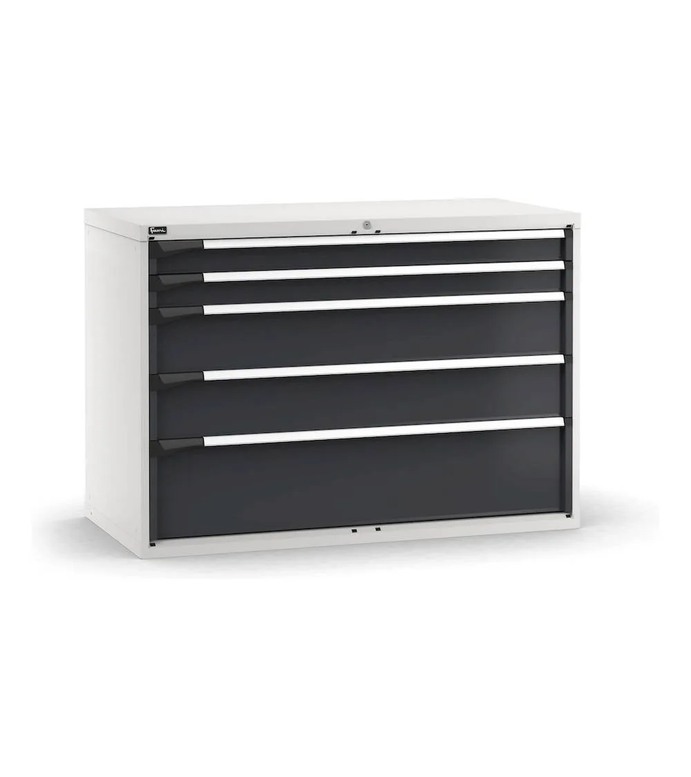 La cassettiera porta attrezzi è una soluzione versatile capace di adattarsi sia ad aree operative che a negozi o uffici. I 5 cassetti ad estrazione flessibile presentano altezze frontali diverse e possono essere organizzati tramite divisori in metallo o cassette divisorio. Oltre ai tradizionali materiali di separazione, i cassetti possono ospitare i vassoi portautensili Pikpad. Il piano superiore può ospitare un top in acciaio o multiplex oppure una copertura in PVC. La serratura a cilindro con chiave mette in sicurezza il materiale riposto nella cassettiera.