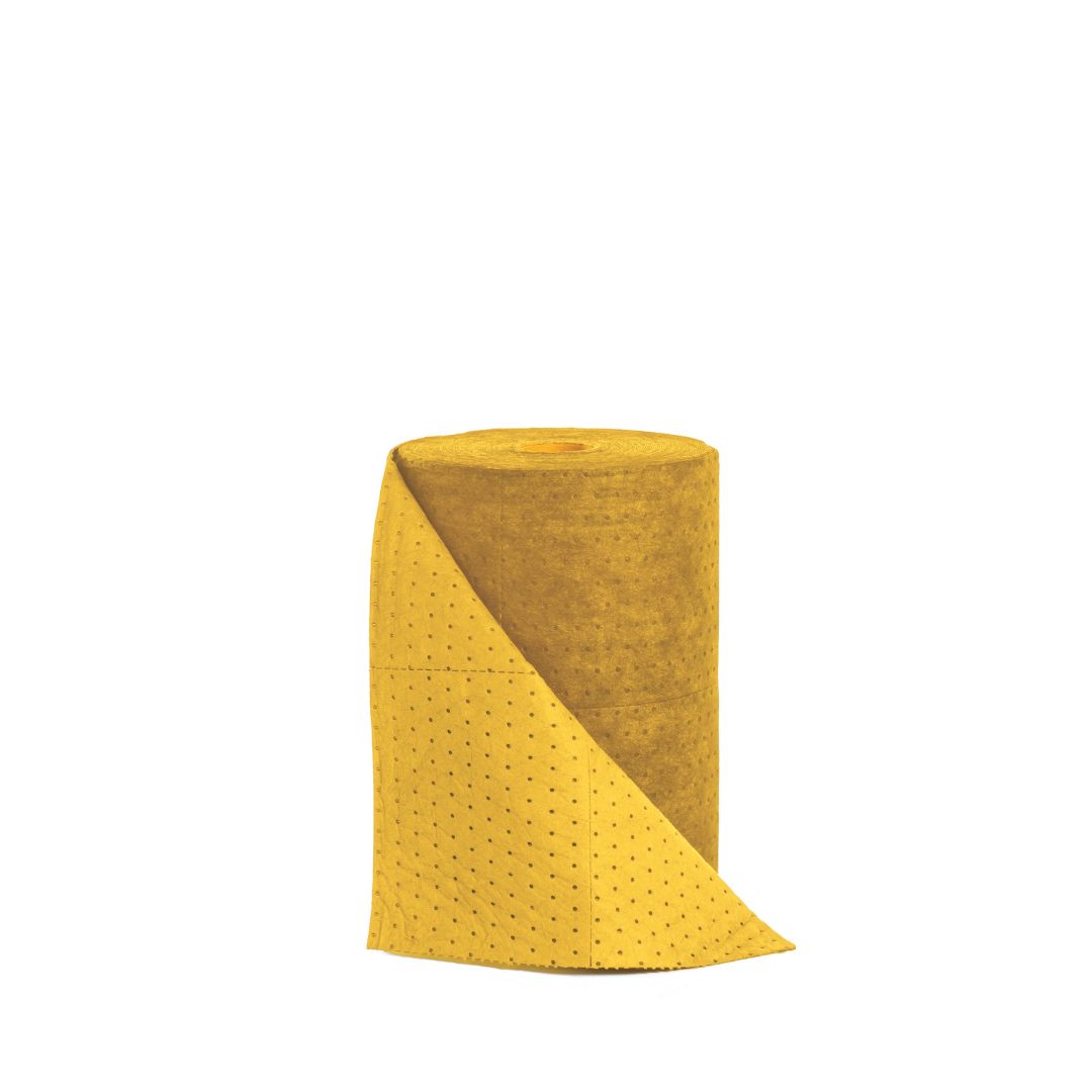 Rotolo assorbente professionale in materiale chimico resistente, ideale per la gestione di liquidi pericolosi in ambienti industriali. Il colore giallo ad alta visibilità garantisce un uso immediato e sicuro.