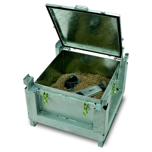 Ideale per la raccolta di batterie danneggiate destinate al riciclo ed allo smaltimento, il contenitore è realizzato in acciaio, con trattamento di zincatura a caldo e coperchio con chiusure di sicurezza
