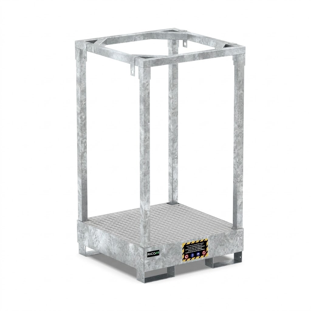 Il contenitore porta big bag è la struttura ideale per la gestione e lo stoccaggio di sacchi di grandi dimensioni. La vasca di contenimento alla base ha una capacità di 200 litri, saldata a tenuta stagna serve per prevenire eventuali sgocciolamenti dal saccone big bag. Il piano di appoggio è costituito da un grigliato zincato. Il telaio anch’esso costruito in acciaio zincato è composto da 4 montanti che sorreggono il cappello superiore in tubo munito di 4 moschettoni ad U per l’aggancio delle bretelle dei sacchi.