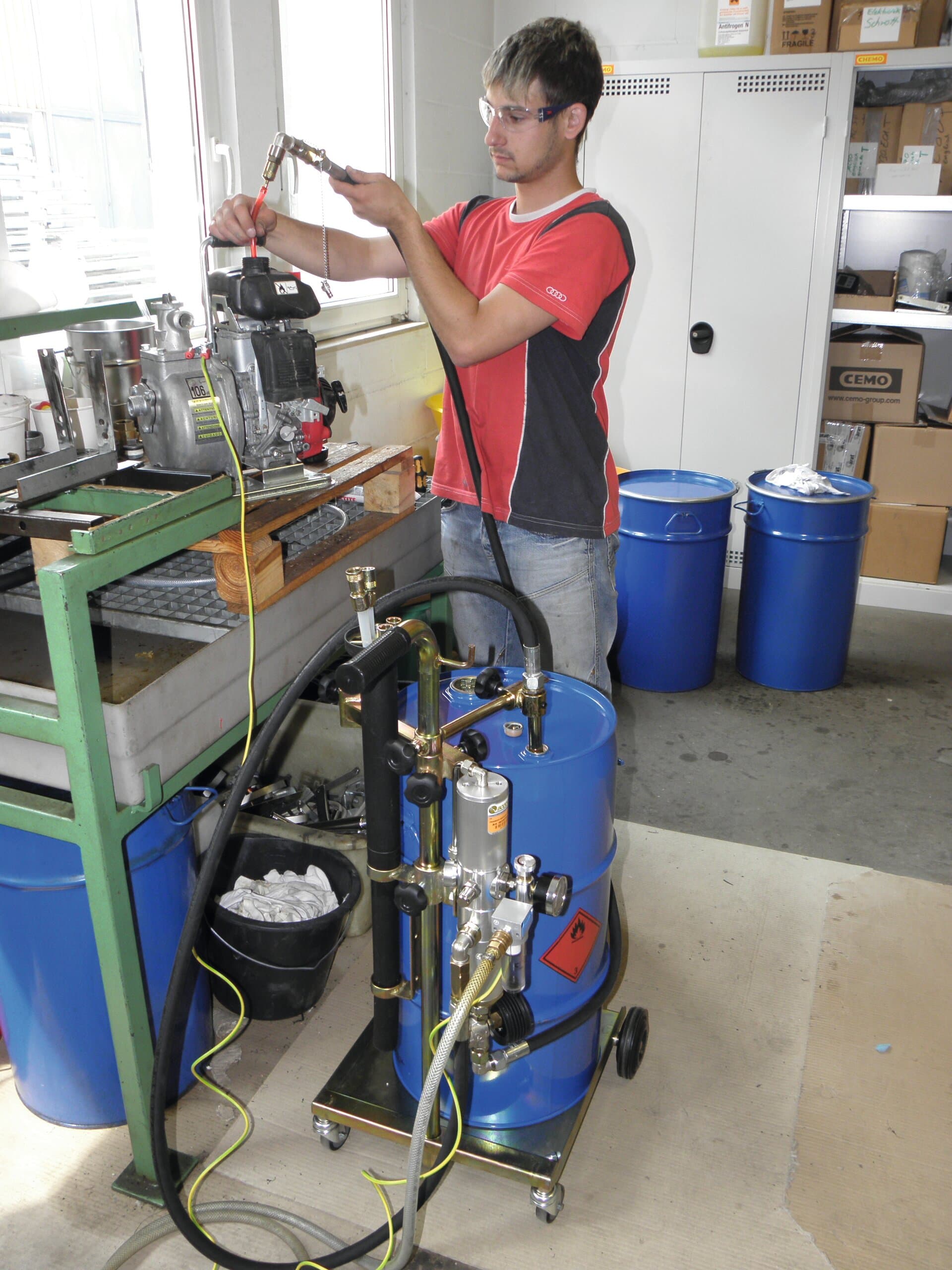 Aspiratore mobile per carburanti, miscele, diesel e olio serve per aspirare il contenuto di serbatoi di autoveicoli e apparecchiature. Se si può formare un’atmosfera esplosiva la direttiva sulla sicurezza aziendale e il regolamento 1999/92/UE (ATEX 137) richiedono un apparecchio omologato per la protezione della salute e della sicurezza sul posto di lavoro.