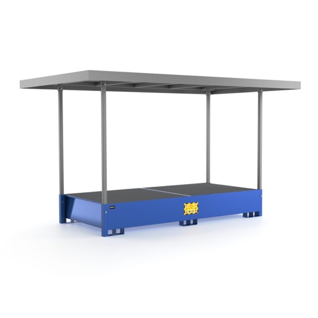 La vasca di raccolta con tettoia è la soluzione più idonea per stoccare in sicurezza fusti e taniche all’esterno. Questo articolo è idoneo al contenimento di 2 cisterne da 1000 Lt. La tettoia zincata permette di essere stoccata all’esterno evitando il riempimento della vasca causato da pioggia e maltempo.
