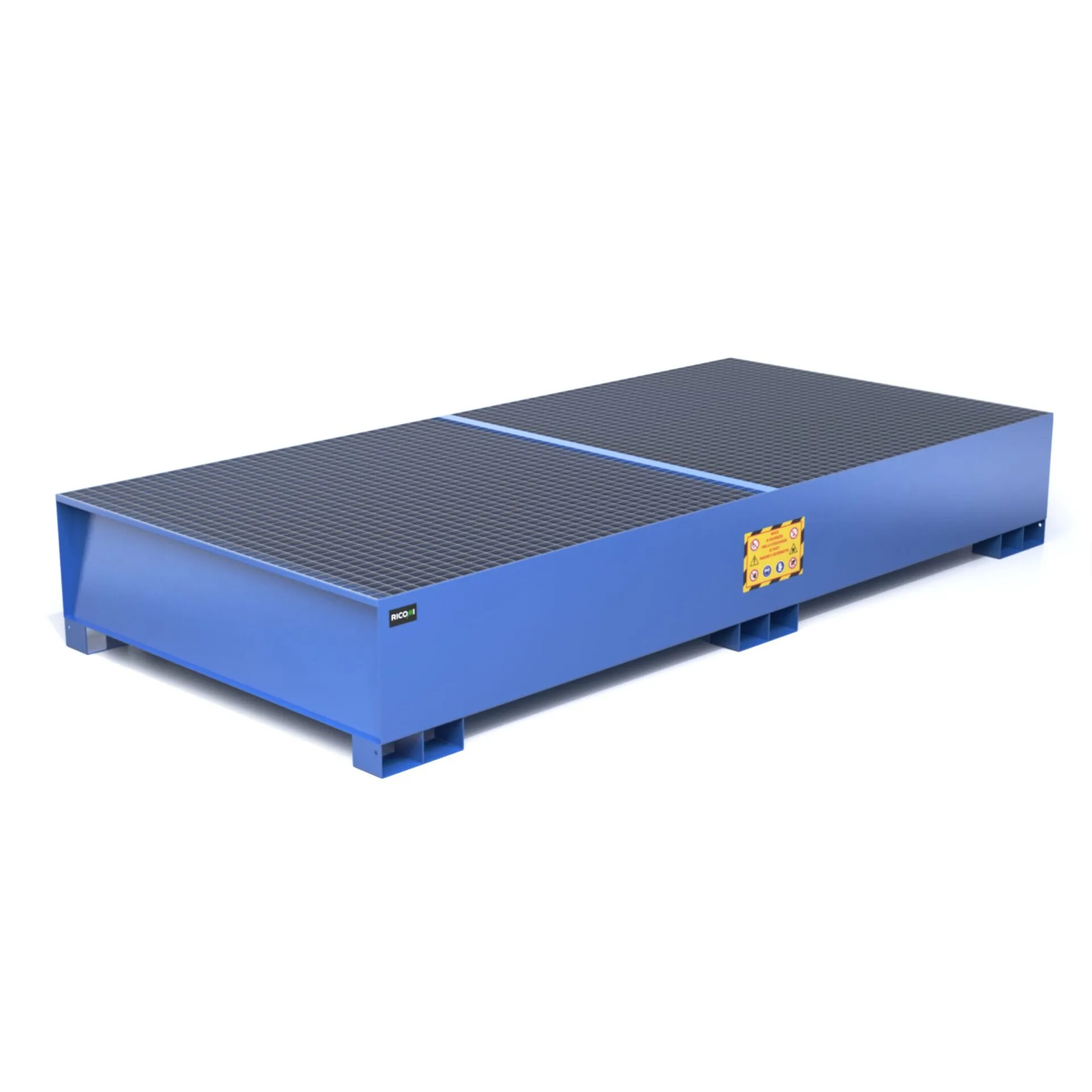 La vasca di contenimento per cisterne è costruita per supportare carichi pesanti, con dimensioni di 2720x1300x420 mm e un volume di contenimento ampio, che consente di ospitare cisterne e contenitori di grandi dimensioni. La griglia superiore zincata, che garantisce una resistenza eccellente agli agenti atmosferici e agli acidi, supporta il carico e facilita il drenaggio in caso di sversamenti.