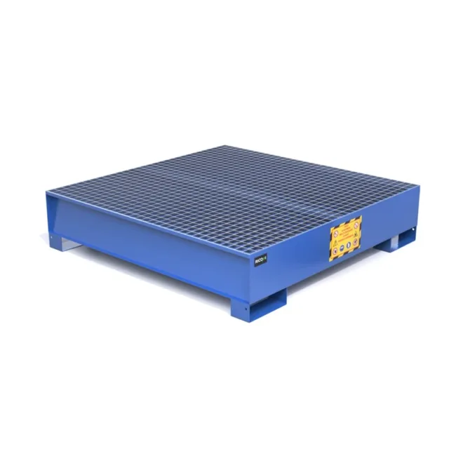 Le vasche di contenimento in acciaio, ideali per ospitare fino a 4 fusti da 200 litri, sono dotate di una robusta griglia zincata removibile che consente il contenimento sicuro di eventuali sversamenti. La struttura sottostante, sigillata e resistente, impedisce qualsiasi fuoriuscita, offrendo così un elevato standard di sicurezza. La griglia superiore è sostenuta da distanziali progettati per reggere il peso a pieno carico, garantendo stabilità e funzionalità.