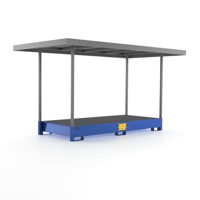 La vasca di raccolta con tettoia è la soluzione più idonea per stoccare in sicurezza fusti e taniche all’esterno. Questo articolo è idoneo al contenimento di 8 fusti da 200 Lt. La tettoia zincata permette di essere stoccata all’esterno evitando il riempimento della vasca causato da pioggia e maltempo.