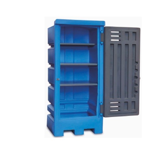 Armadio per lo stoccaggio in sicurezza di prodotti chimici. Disponibili con 3 ripiani in metallo zincato (su richiesta disponibile ripiano aggiuntivo). Stampato 100% con polietilene resistente alla corrosione.