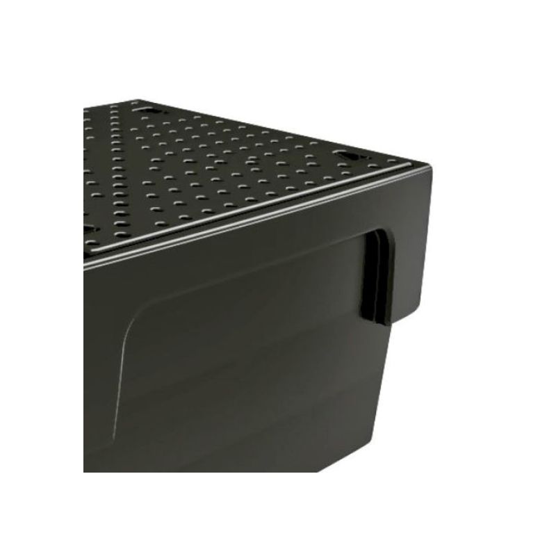 Vasca di raccolta in polietilene nero per lo stoccaggio in sicurezza di cisterne da 1000 lt. Movimentabile con transpallet o carrello elevatore.