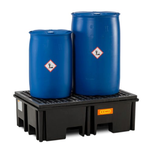 Vasca di raccolta in polietilene nero per lo stoccaggio in sicurezza di fusti da 200 lt. Movimentabile con transpallet o carrello elevatore.