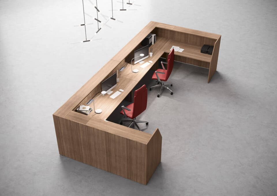 Spazi ordinati, banco con superficie ampia e postazioni multiple. Necessaria la presenza di moduli contenitivi e passacavi per gestire la documentazione.