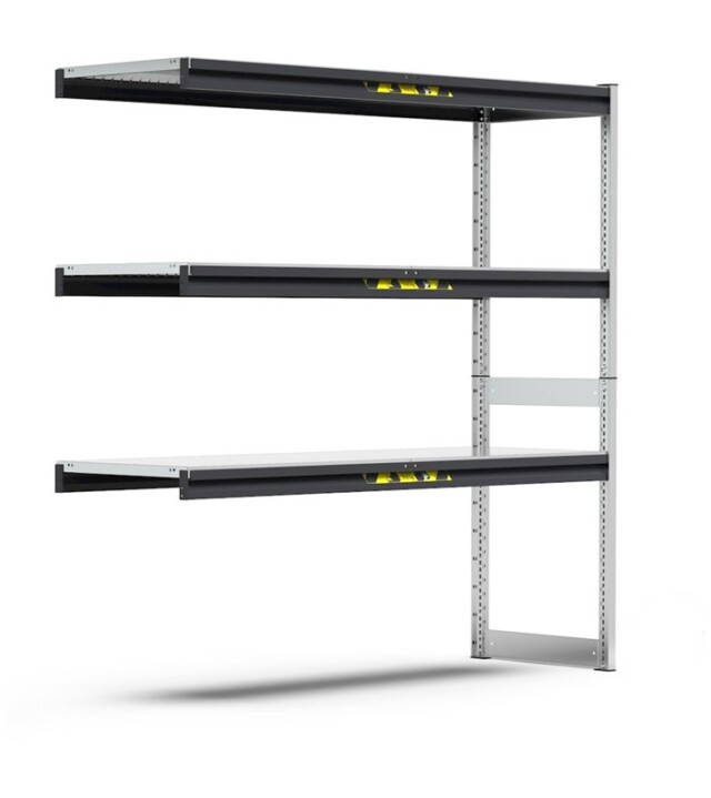 Questa scaffalatura aggiuntiva amplia gli scaffali a campata larga per poter aumentare facilmente lo spazio di stoccaggio a disposizione in magazzino. Presenta 3 coppie correnti ognuna delle quali è dotata di due piani fessurati da 400 mm di profondità. Ogni coppia corrente ha una portata di 250 kg e può essere utilizzata da sola oppure allestita con ripiani. Come tutte le soluzione di scaffalature System ST, anche questo scaffale ha un montaggio ad incastro senza viti e utensili.