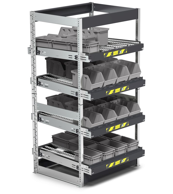 Scaffale dinamico a 4 piani con rulli inclinati