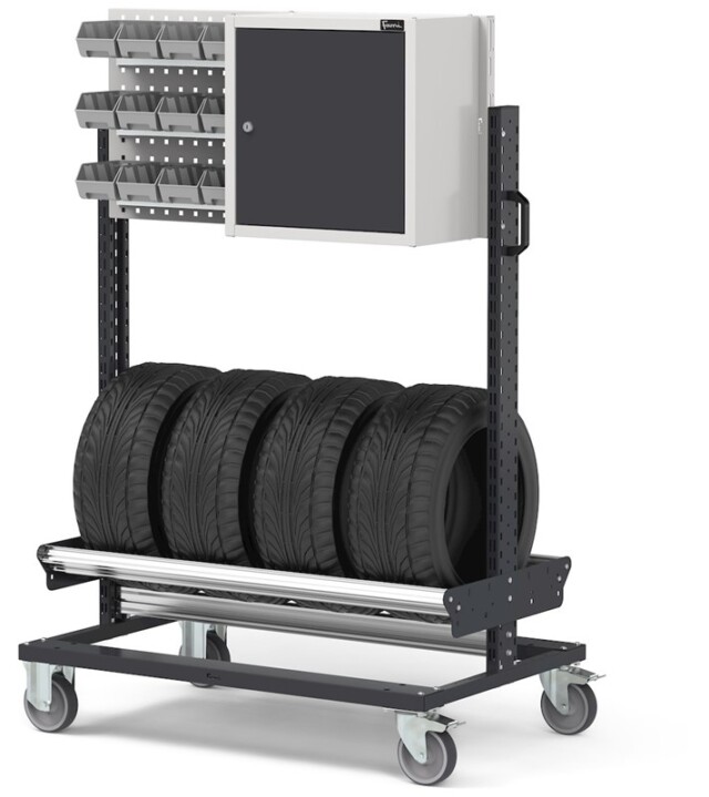 Il carrello per penumatici Bin Cart combina il tradizionale carrello per pneumatici con un carrello porta attrezzi. Nella parte inferiore, infatti, è possibile stoccare in ordine e sicurezza un treno di gomme, mentre nella parte superiore è presente un pannello forato con contenitori a bocca di lupo e armadio pensile per la custodia di minuteria, viteria e attrezzatura utilizzata solitamente nel processo di cambio gomme.